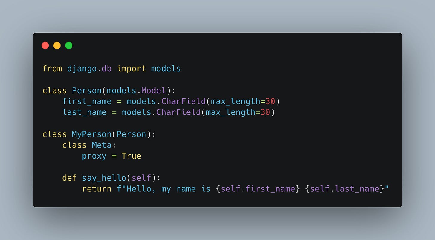 Proxy models are your choice when you want to modify the behavior of a model but not its structure. Using this approach, the proxy model shares the same database table as its parent but can have different behaviors and methods.